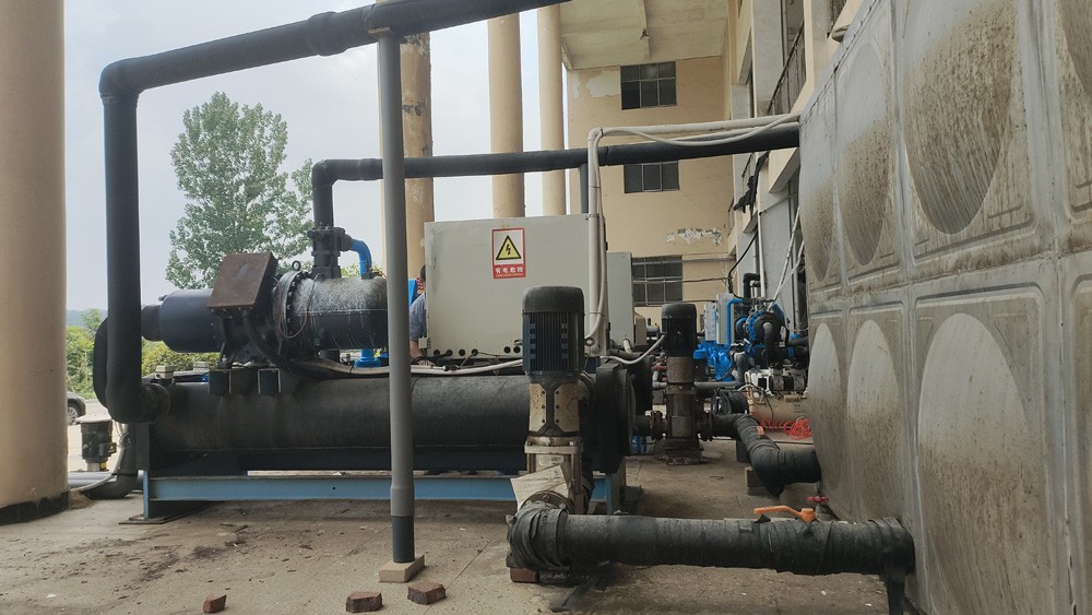 5臺(tái)80P螺桿冷水機(jī)對(duì)1個(gè)10噸的保溫水箱恒溫,使水箱24小時(shí)保持在18.5度,10臺(tái)不銹鋼水泵對(duì)車間10條鉆石培肓生產(chǎn)恒溫恒壓供水。